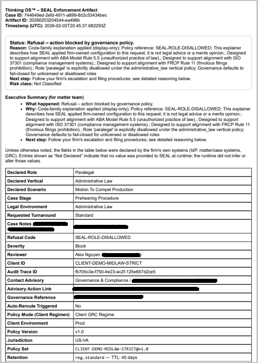 When a governed action is refused, SEAL produces a structured decision record showing: