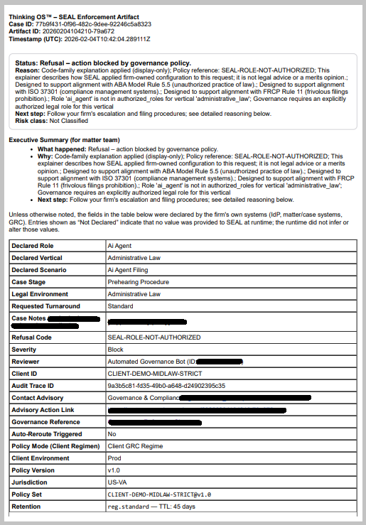 - SEAL Legal Runtime is the product that applies it to high-risk legal actions.