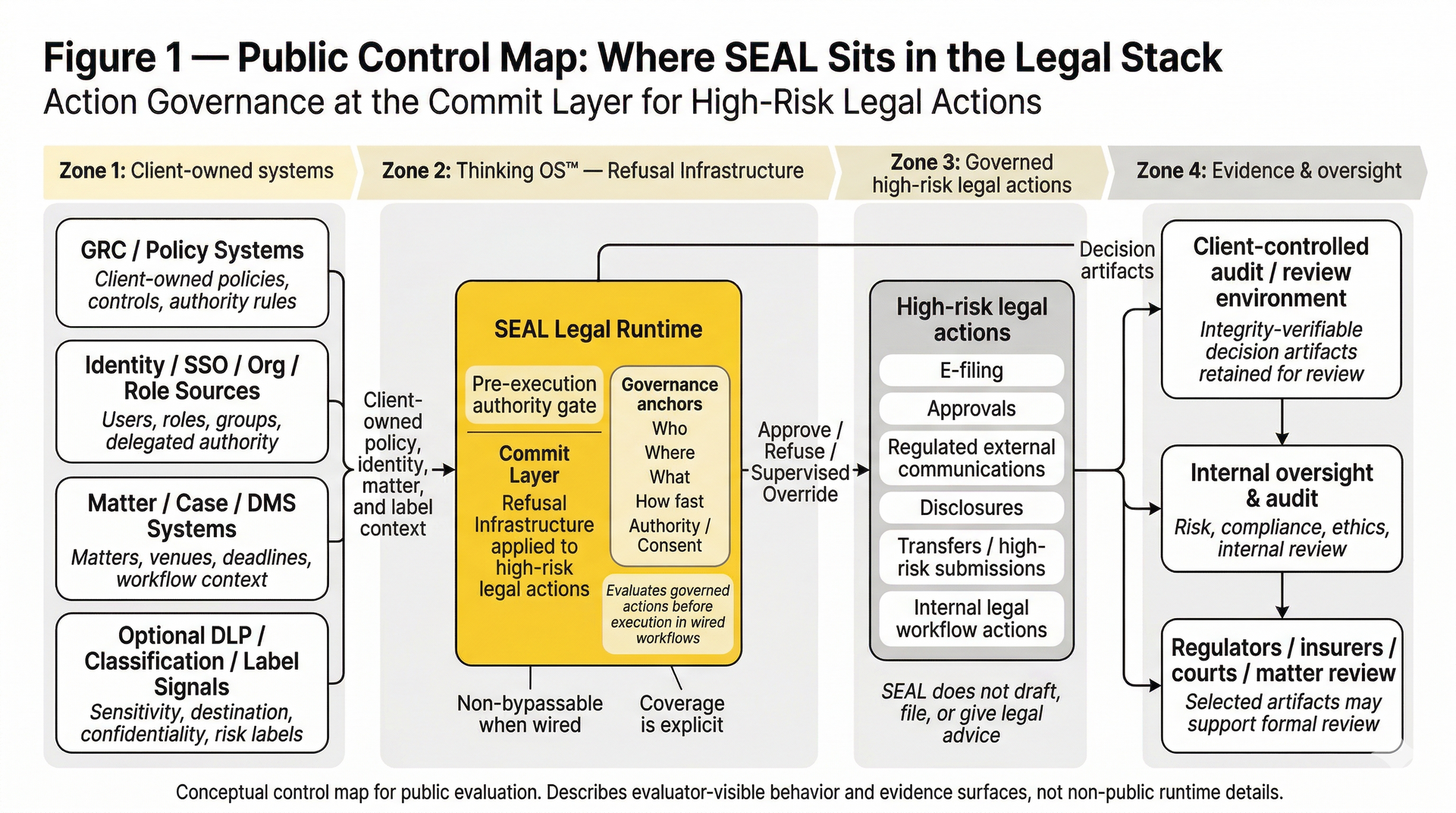 In your stack, that is not a new category. It is what Action Governance looks like as a control objective at the Commit Layer. Refusal Infrastructure is the architecture that implements it. SEAL Legal Runtime is the product that applies it to high-risk legal actions.