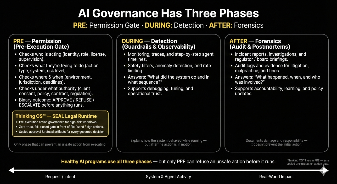 Refusal Infrastructure for Legal AI is a pre-execution authority control for high-risk legal actions. It implements Action Governance by placing a sealed governance layer (SEAL Legal Runtime) in front of wired legal workflows. At runtime—before anything is filed, sent, or executed—it decides whether an action may proceed, must be refused, or requires supervision, and produces a sealed, tamper-evident artifact for every governed decision. It is not IAM, not model guardrails, and not GRC; it is a separate execution-time governance layer.