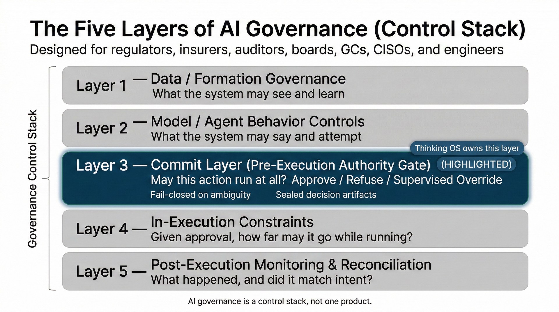 Thinking OS specializes in Layer 3: the Commit Layer (pre-execution authority + sealed decision artifacts). We intentionally do not claim to be “the AI governance platform.”